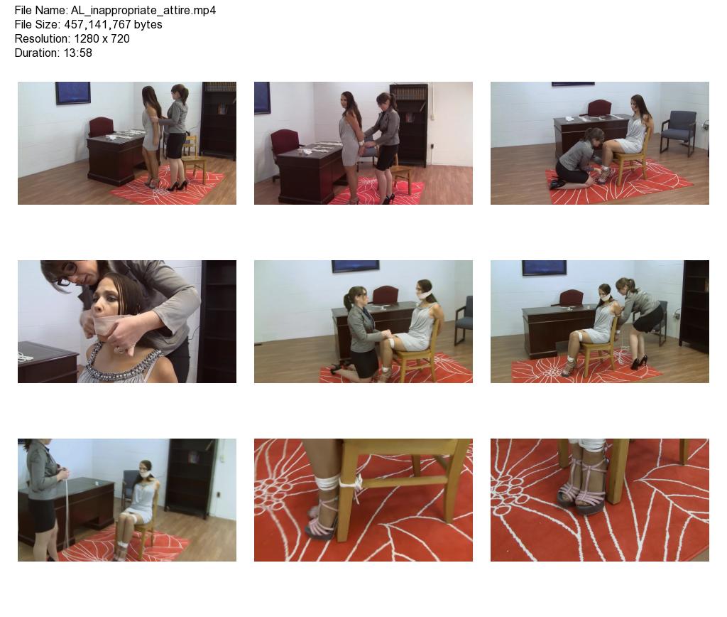 Anna came into the office to meet with Ms Andrews, but for what she wasn't sure. Lizz quickly enlightened her as to the problem with her dress and heels and how much skin she was showing off. Which ordinarily wouldn't be a problem, but this day conservative potential clients were coming and touring the office and there'd been a memo about the attire for that day. Elizabeth wastes no time and binds Anna's wrists tightly behind her back and seats her in a chair. Grabbing another piece of rope Elizabeth kneels and binds Anna's ankles together next with Anna still putting out attitude. Elizabeth has had enough mouth at this point and stuffs Anna's mouth with a white cloth and wraps her head with medical tape tightly sealing the gag material in her mouth. With her mouth properly silenced Elizabeth goes back to the business of tying Anna up and binds her knees tightly together. Finally she grabs some rope and seals Anna's elbows tightly together behind her back. A last rope attaches poor Anna to the chair and Lizz takes that opportunity to take her leave to make sure the visit is still going well. Anna is left tightly bound and gagged on her chair perch and she starts wiggling and trying desperately to find some slack or comfort in her tight binds and gag. Slow sensual struggling is something Anna can definitely deliver though and a nice slow moan combined with pleading eyes over her gag make her a nice visual.