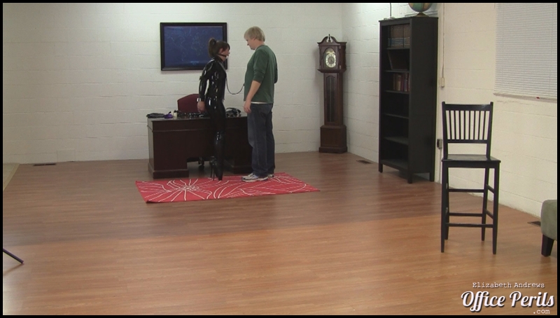 Lizz is posted up against Mr Big Boss's desk in her black latex catsuit, waist cincher, and black leather ballet boots. Her elbows are tightly strapped behind her back as she stands on her tortuously high heels. He moves on to her wrists as she stands steady awaiting the training to commence. After a final tightening of her elbow strap he allows her to sit down on the desk as he shoves a large white ballgag into her mouth strapping it tightly behind her head. With all those steps in place Mr Big Boss places a collar around her neck and leashes her off to get her walking started. The camera opens up on a wide expanse of floor and Lizz being led back and forth across it being XXXX to walk back to the desk over and over till finally she is allowed rest on the desk. Finally with her pacing complete her ballgag is removed and her drool wiped up with the cloth that is then roughly shoved into her mouth packing her cheeks before taking microfoam tape and wrapping it tightly around her head. Following suit is a black leather gwen hood laced tightly on her head with her ponytail peeking out. She's then placed on the ground and her ankles are tightly strapped together with a strap attaching her ankles to her elbow straps. She struggles and wiggles managing to roll over a few times relieving slightly the strain on her hogtie straps. Eventually with her working with the slick latex she's works her elbow bonds down only to find they are replaced and her hogtie is moved to her ankles and pulled equally tight.