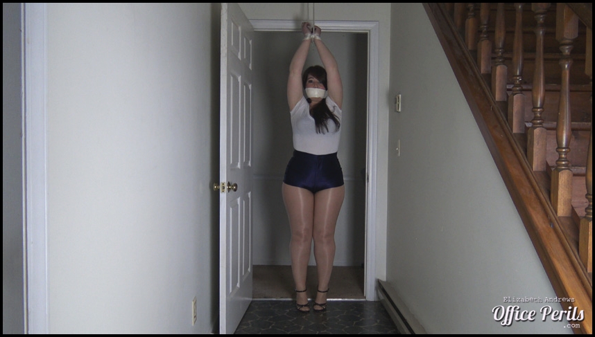Elizabeth is tied with her hands outstretched over her head while dressed in tight disco shorts and pantyhose.  David moves in and gags her with mouth packing and microfoam wound around her head before adding a crotch rope and knee hobble leaving her to teeter in her high heels.  Eventually he returns and finishes her off by binding her ankles tightly together leaving her to struggle standing in her bondage.
