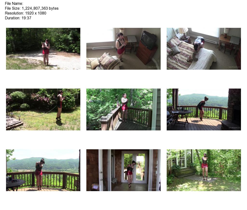 Lizz finds herself on vacation with the mysterious man who apparently loves latex. Shes at his vacation home walking slowly down the gravel driveway carefully in her six inch heels bringing the mail back. A task made much more complicated by her ankles being changed together. She makes it to the wooden walkway her high heels clicking on the boards as she navigates her way up a couple stairs made more difficult by her short ankle chain. Lizz puts the mail down and navigates into a guest room where she makes a used bed with her cuffed wrists before heading back out. She navigates back down the stairs to a garden hose that she picks up and starts watering the landscaping with walking around navigating the treacherous terrain in her six inch heels. She puts the hose up moving out to the deck to admire the view a bit. Apparently someone took notice of that though and suddenly her arms are bound behind her with a leather armbinder and she moves out to the rail. Someone has set their mind to decide that she can enjoy the view but only with some strict elbow bondage and a panel head harness ballgag. Eventually Lizz tires of the view and makes her way back out into the front yard. Moving back into the gravelly soil and wandering around all the while with her arms tightly strapped behind her. Making her way back ot the house she finds her way back out onto the eave of a deck and struggles a bit in the shade.