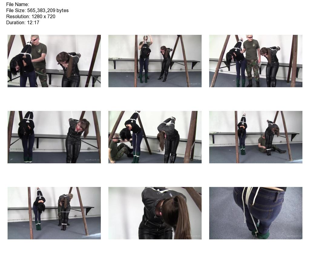 I was snooping around the front area of the warehouse that I believed the arms dealers were working out of. I wanted to seem like I fit in more with the crowd that would hang around this place so I had on a leather jacket, leather pants and lace up knee high boots. Next thing I know I was strappadoed beside a lovely brunette. At first I didn't recognize who she was but then it hit me. I had seen her hanging around the newspaper office as well. I didn't think she worked there but why would she be hanging around this place? Her arms looked painfully raised in the air behind her. Her elbows looked like they were touching and she was making unpleasant noises behind the gag that filled her mouth. My arms were thrust up in the air behind me as well. I could feel the strain and tension in my shoulders and neck. There was a huge ball in my mouth and with my body XXXX over from the painful strappado, the drool started to flow. I looked over at the brunette beside me and she looked in a lot of pain.The man with the sunglasses and mustache was standing in between us sans the cigarette this time. He had rope in his hand and I wasn't sure what he was going to do with it. I hoped he would just let us go. He told me to tell him what I knew and wanted to know what I was doing there. If I didn't answer he was going to hurt my friend. I guess he thought we were together, though we weren't. I shook my head no at him and told him to just let her go. She didn't know anything anyway and him and I could come to a deal. But this was all behind the huge gag filling my mouth so I'm sure he heard none of it and only saw my head shake no. He tied a crotch rope on the brunette and tied it off to her hands that were raised painfully into the air. I felt bad that she got caught up in this whole mess, but if you come looking for trouble sometimes that is what you get. He then tied her ankles together and I could tell her balance was thrown off. Afterwards, he added a rope from her crotch rope to her ankles back to her crotch. He tried to get me to talk but I wouldn't. I had questions of my own that I wanted answered. He came over to me and tied my boots together. He then added a rope around my thighs and lashed me off to the side bar of wooden contraption we were strappadoed underneath. I tried my damnest to get out of that rope but I couldn't. He grabbed the leggy brunette's throat and threatened her. I was hoping that at some point we could get out but I wasn't sure how that was going to happen. We both struggled as much as we could to loosen our bounds but all it did was tighten the knots.