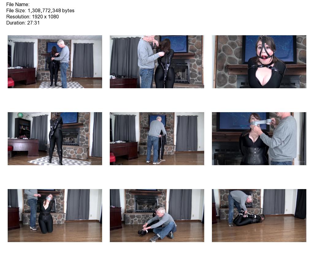 Lizz enters the room in her very high heeled boots for some elbow training. Mr. Big Boss grabs some straps and uses them to aid him in pulling her arms together and getting an armbindered zippered onto her arms. With the armbinder in place a head harness ring gag is added and she's left to train and drool on the office floor. Lizz finds that her shoes might not have been the best choice as the burn sets into the balls of her feet from being made to walk around in such extreme high heels. When Mr. Big Boss comes back he takes that into account and hogties her in front of his fireplace instead. With her hogtie in place and mouth packing and a tape gag muffling her cries she's left to struggle by Mr. Big Boss who heads off to dinner after a few parting gropes.