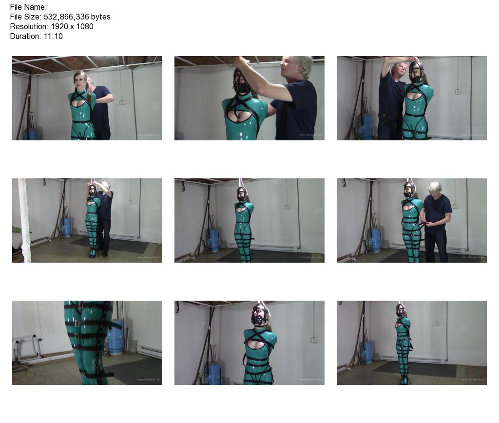 Cobie is wearing a turquoise footed cat suit and a leather leg harness which prevents her from moving. Mr. Big Boss binds her arms into a leather arm binder, throwing Cobie slightly off balance. Cobie is then gagged with a heavy duty leather harness that has a ball attached to the other side of the panel. A rope is attached to the d-ring on top of the harness gag and Cobies body is stretched out in the process. A few more leather straps are added to Cobies XXXX standing tie to up the difficulty. Her arms are layered in leather and restricted to her body. Cobie tries to maintain the balance act for long as possible until her eyes plead for release.